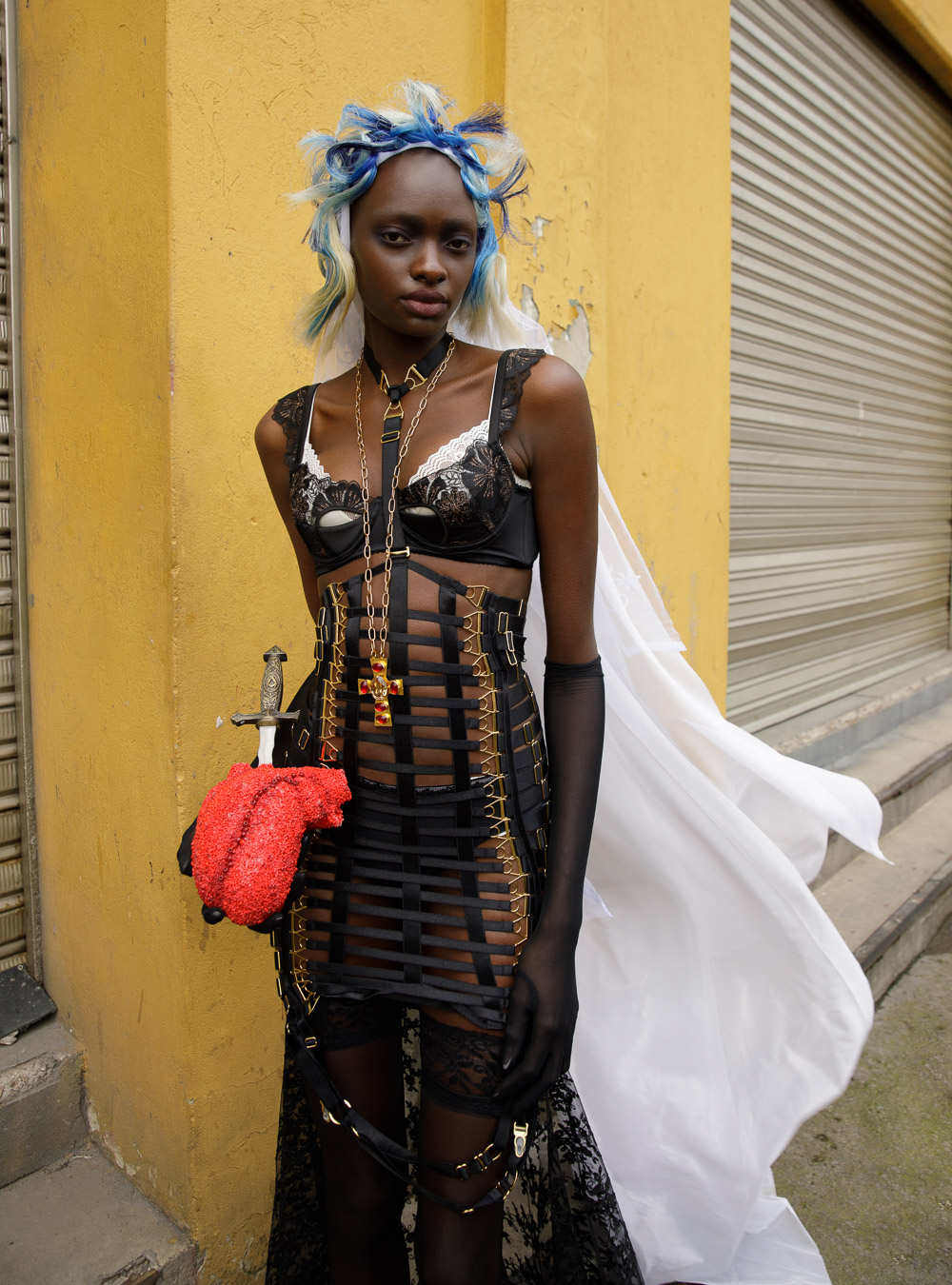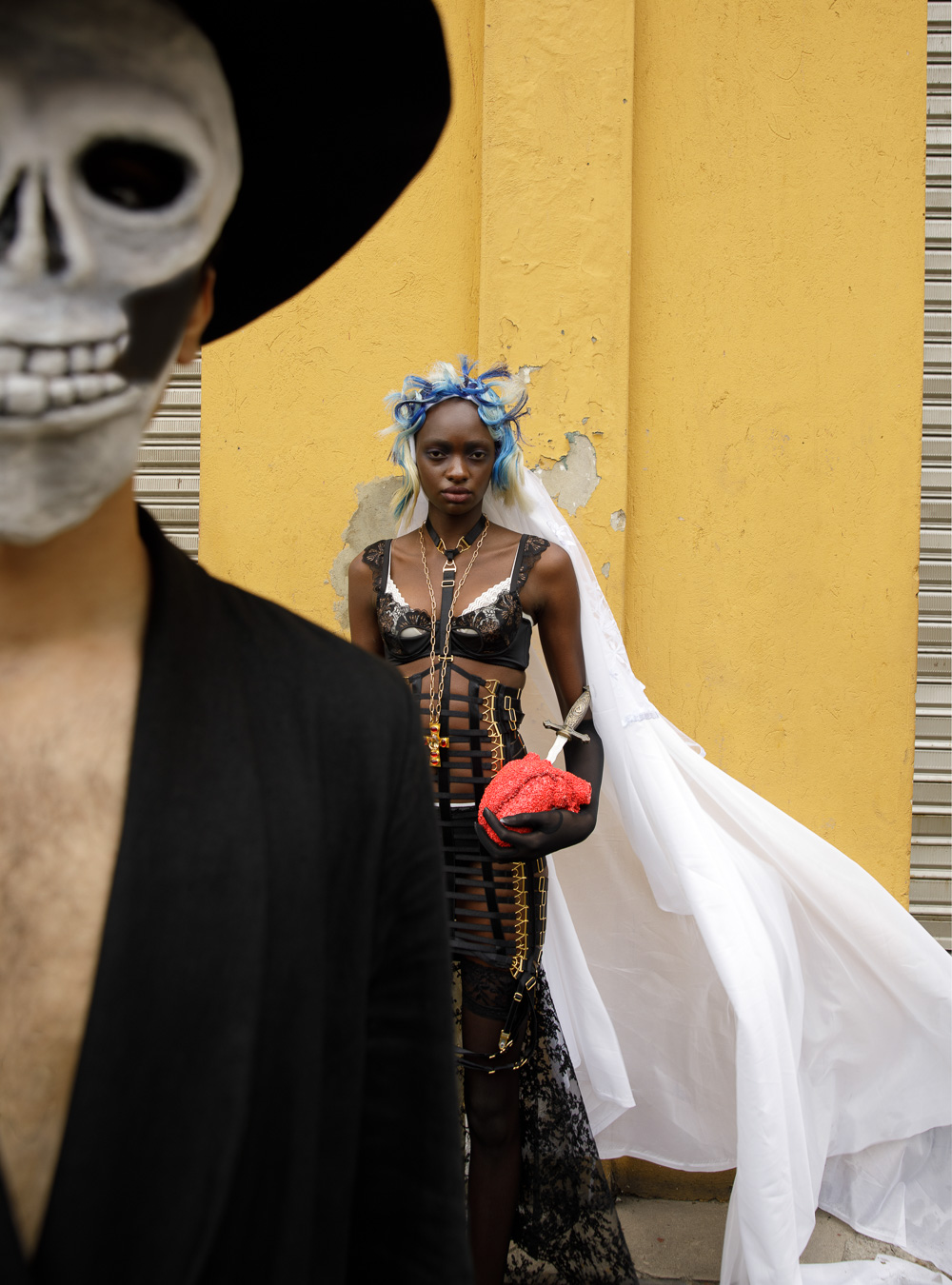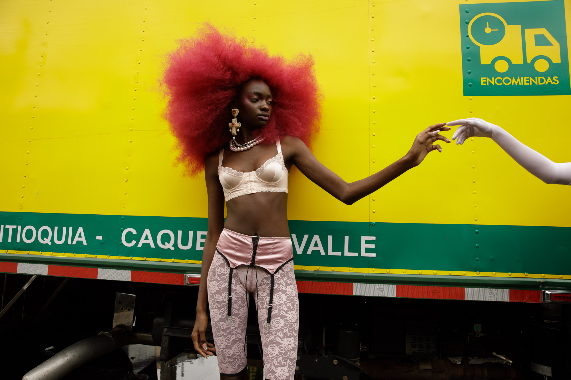 (L) hat DANIENYSTREAM shirt A NEW CROSS; pants CHRISTO TRIANA; shoes MAISON MARGIELA; (R) bras SOREIL LINGERIE; dress SANTISIMAS ROPA INTIMA; necklace MERCEDES SALAZAR; shoes DAMAYA