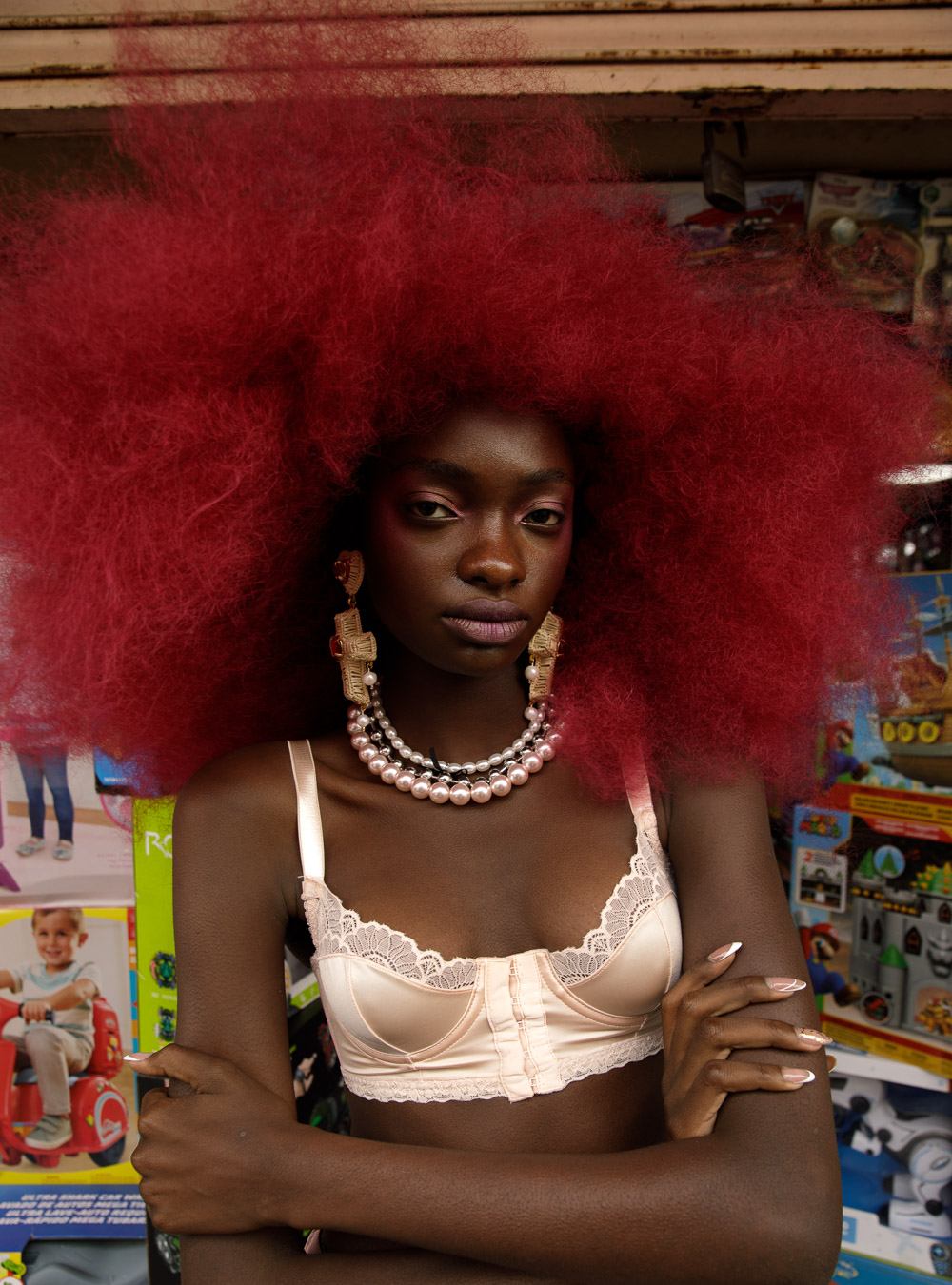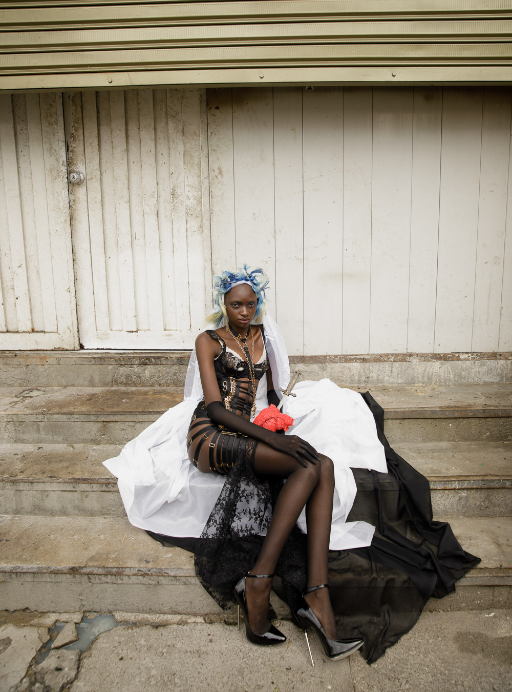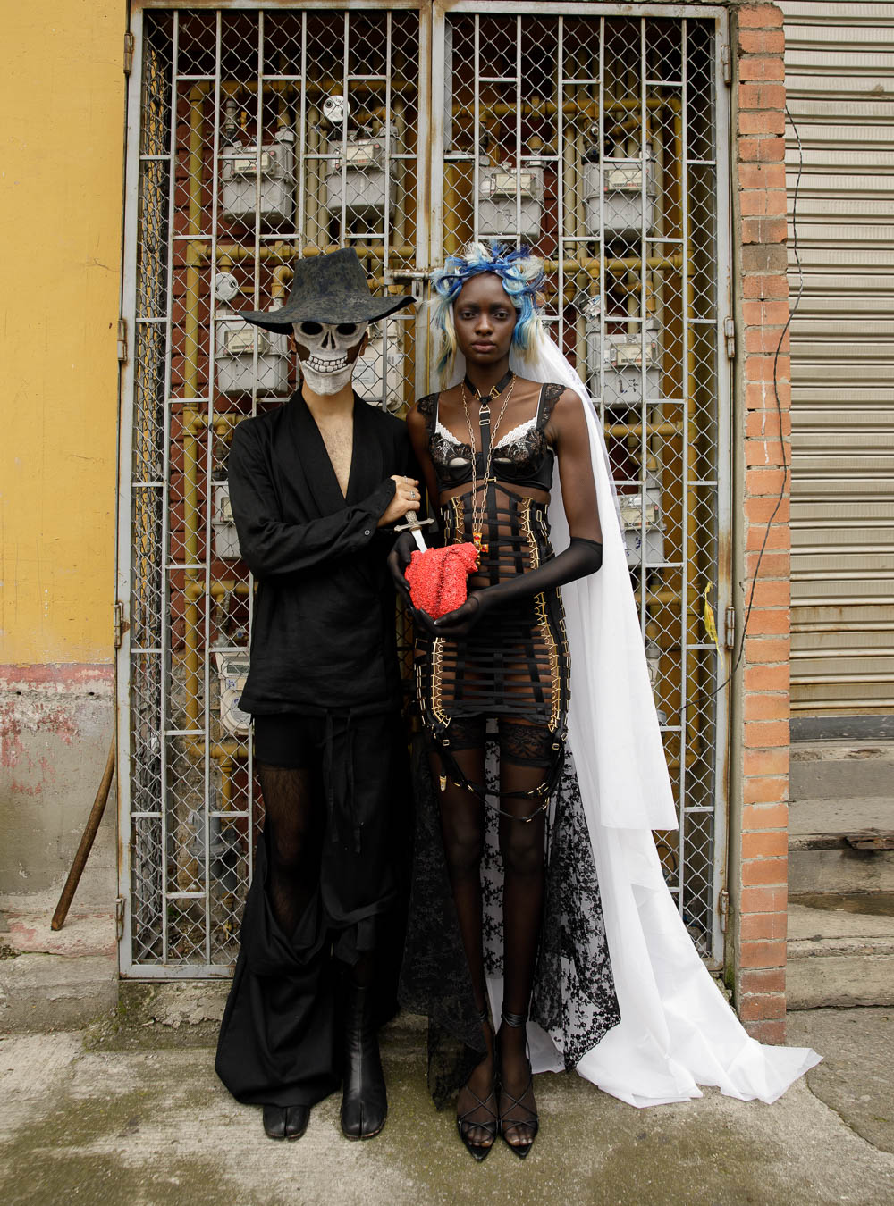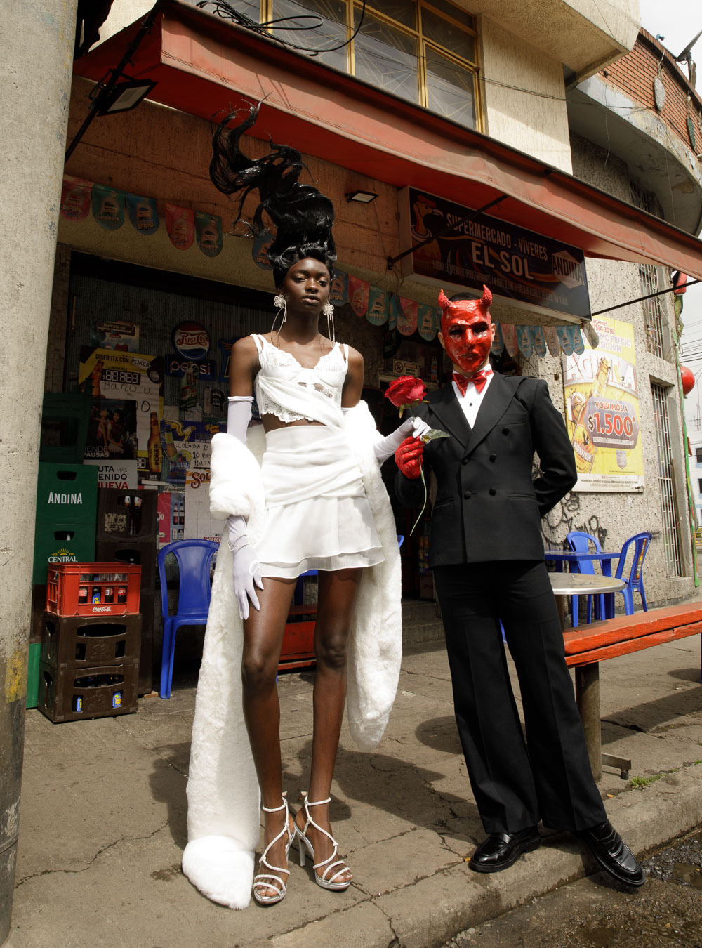 (L) hat DANIENYSTREAM shirt A NEW CROSS; pants CHRISTO TRIANA; shoes MAISON MARGIELA; (R) bras SOREIL LINGERIE; dress SANTISIMAS ROPA INTIMA; necklace MERCEDES SALAZAR; shoes DAMAYA